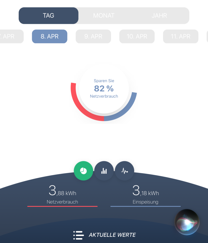 Weiter wird von der Powerfox- Appllikation gezeigt, dass 3,88 kWh aus dem öffentlichen SH-Netz entnommen wurden. Die im eigenen Haus verbrauchte Energie beträgt somit 3,88 kWh + 4,45 kWh, also in Summe 8,33 kWh.