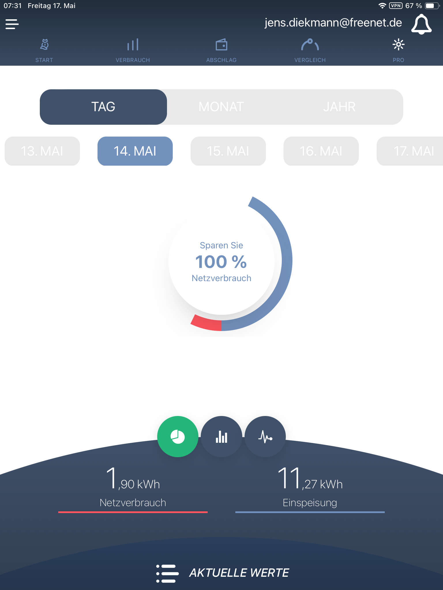Für diesen Tag betrug die Vergütung des eingespeisten Stroms 33 % mehr als der Wert des aus dem Netz bezogenen Stroms!