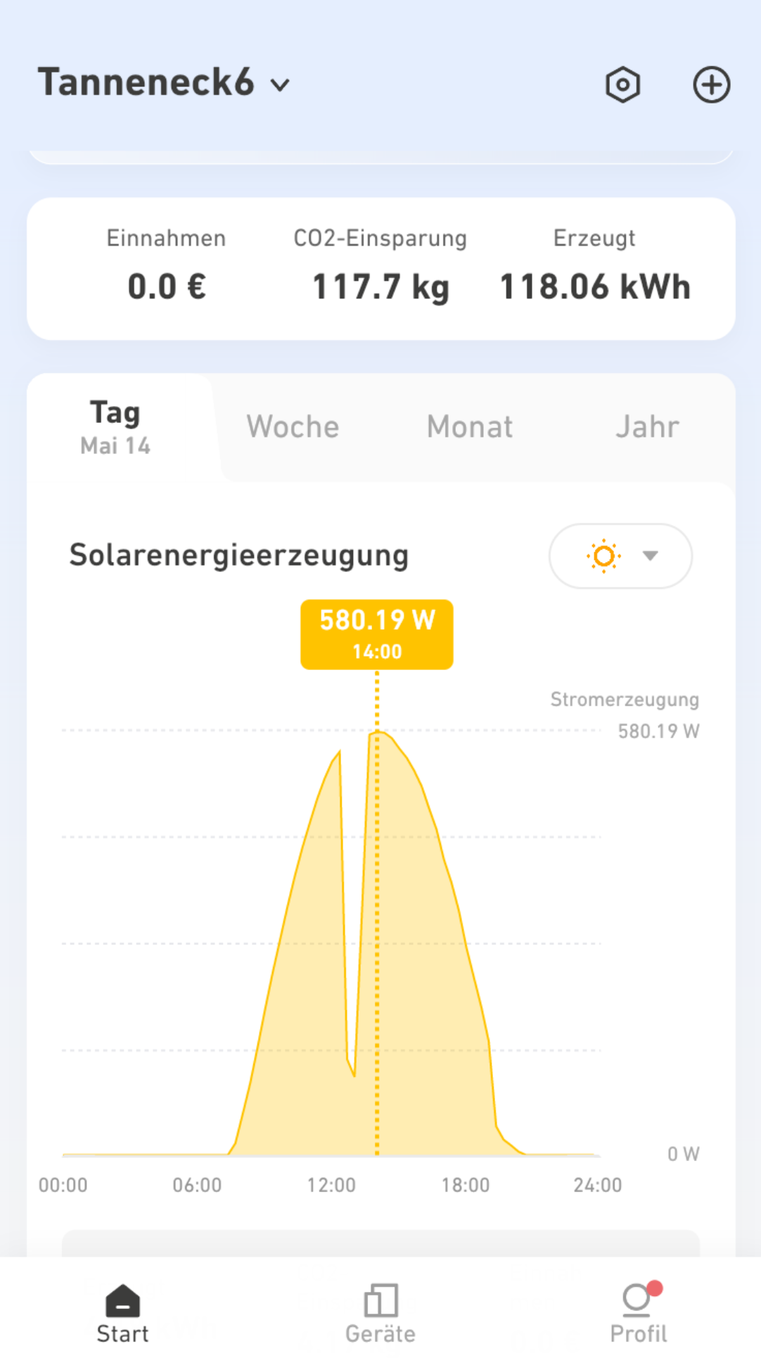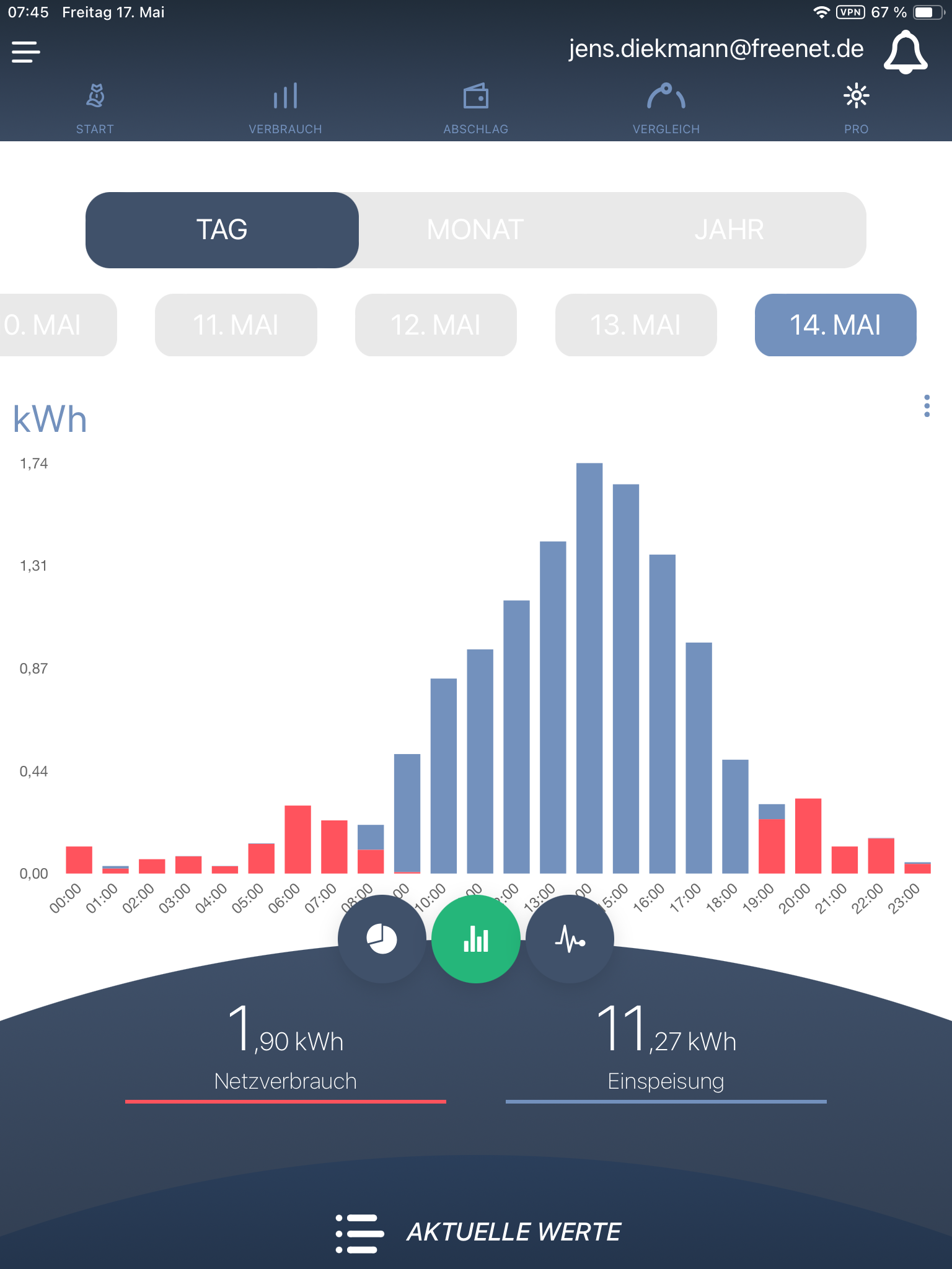 Der Zeitraum von 14 Uhr bis 15 Uhr war mit 1,74 kWh besonders ertragreich.