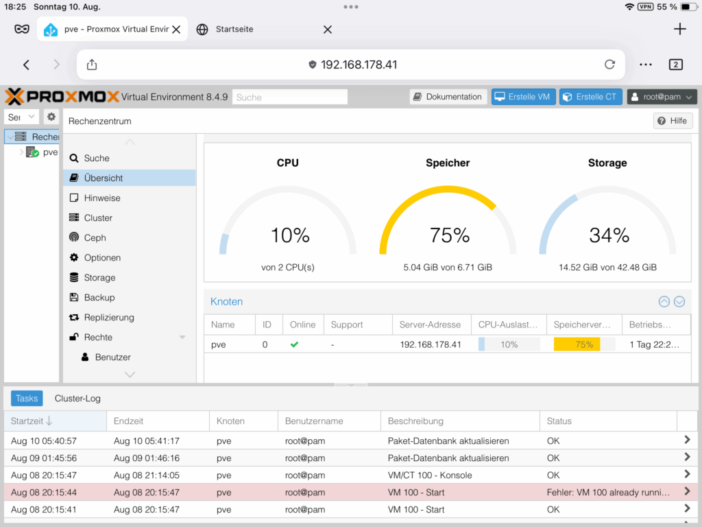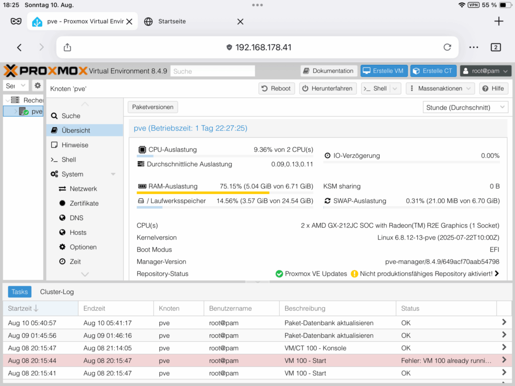 Weil dieser Server insgesamt nur über 8 GB RAM und 64 GB Festplattenspeicher verfügt, ist dieses System mit dieser VM schon sehr stark ausgelastet.