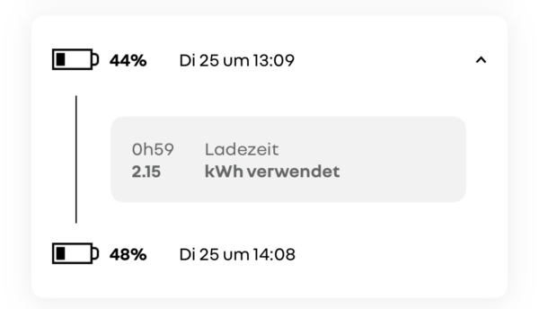 Die im Bild oben rechts angezeigte Energiemenge aus der Ladehistorie des Fahrzeugs entspricht nicht der Energiemenge, welche auch im Akku des Fahrzeugs ankommt. Um diese Energiemenge zu erfassen, ist ein etwas höherer Aufwand erforderlich.