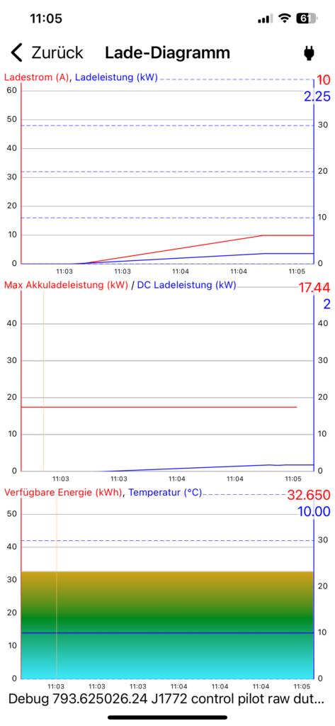 In den obigen Diagrammen kann man auch ablesen, wie viel Energie sich zum Messzeitpunkt im Akku befindet. Die nutzbare Energiemenge eines Renault Zoe mit einem 52-kW-Akku und einem SoH von ca. 97 % beträgt in etwa 48 kW.