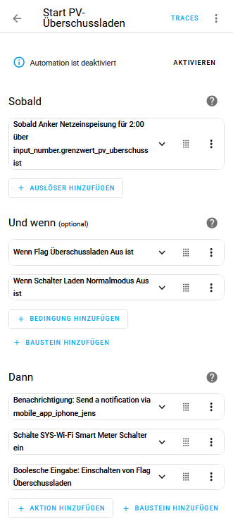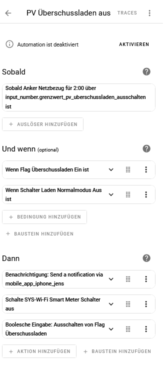 In der Praxis werden dann von dieser Smart-Home-Applikation noch weitere fahrzeugspezifische Parameter ausgewertet und gesteuert (z.B. ob das Ladekabel eingesteckt ist und auch die Abschaltung des Ladenvorgangs über die jeweilige Fahrzeug-Applikation wie z.B. VW Connect).