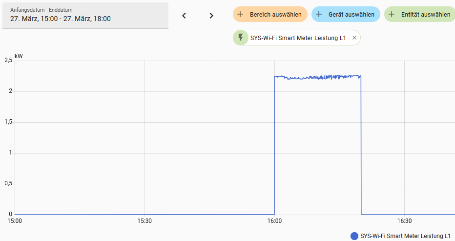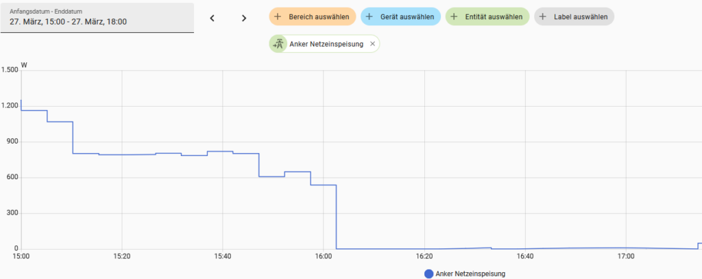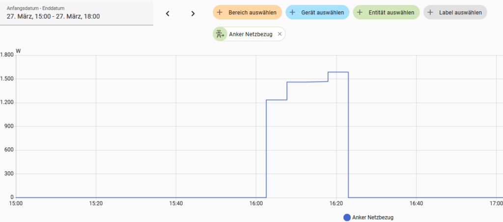 Über die Zeit erhöhte sich der Netzbezug bis zu einem Wert von 1500 Watt, was zum Abschalten des PV-Überschussladens führte (siehe das rechte Bild).