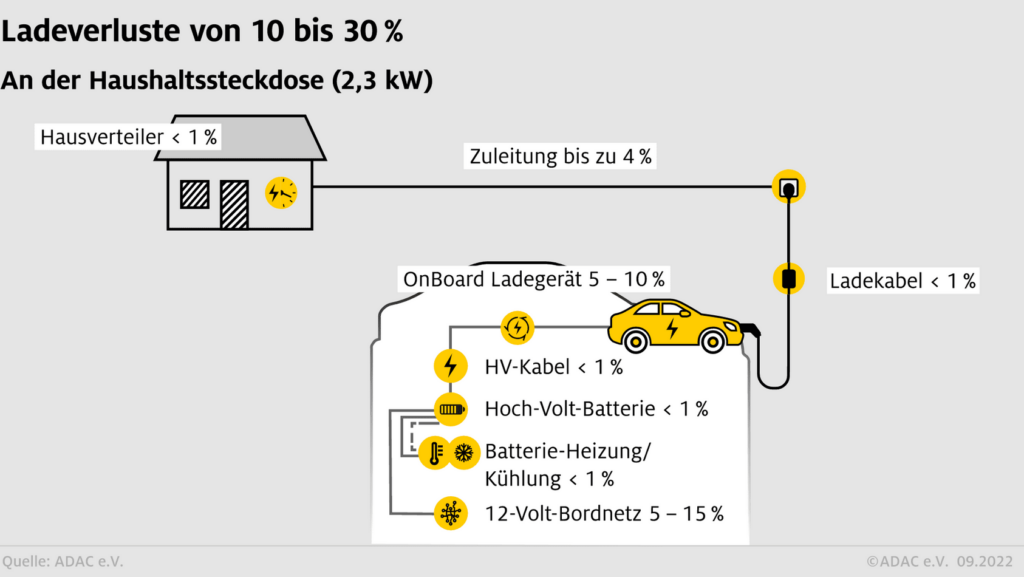 In der Übersicht des ADAC ist zu sehen, dass der Ladeverlust in der Hausinstallation, Zuleitung und im Ladekabel bis zu 5 % ausmacht. Diesen Bereich gilt es zu optimieren: In meinem Projekt zum PV-Überschussladen werde ich diese Energieverluste auf ein Minimum reduzieren.